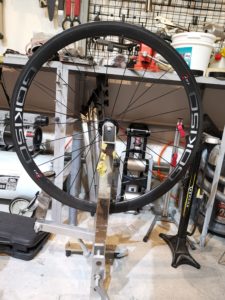 元々はこのピンクのクライマーS特注品で組まれていたホイールを、お客様ご自身でノーマルの黒ハブに組み換えたモノを仕上げ調整してほしいとの事でお持ち頂きました。