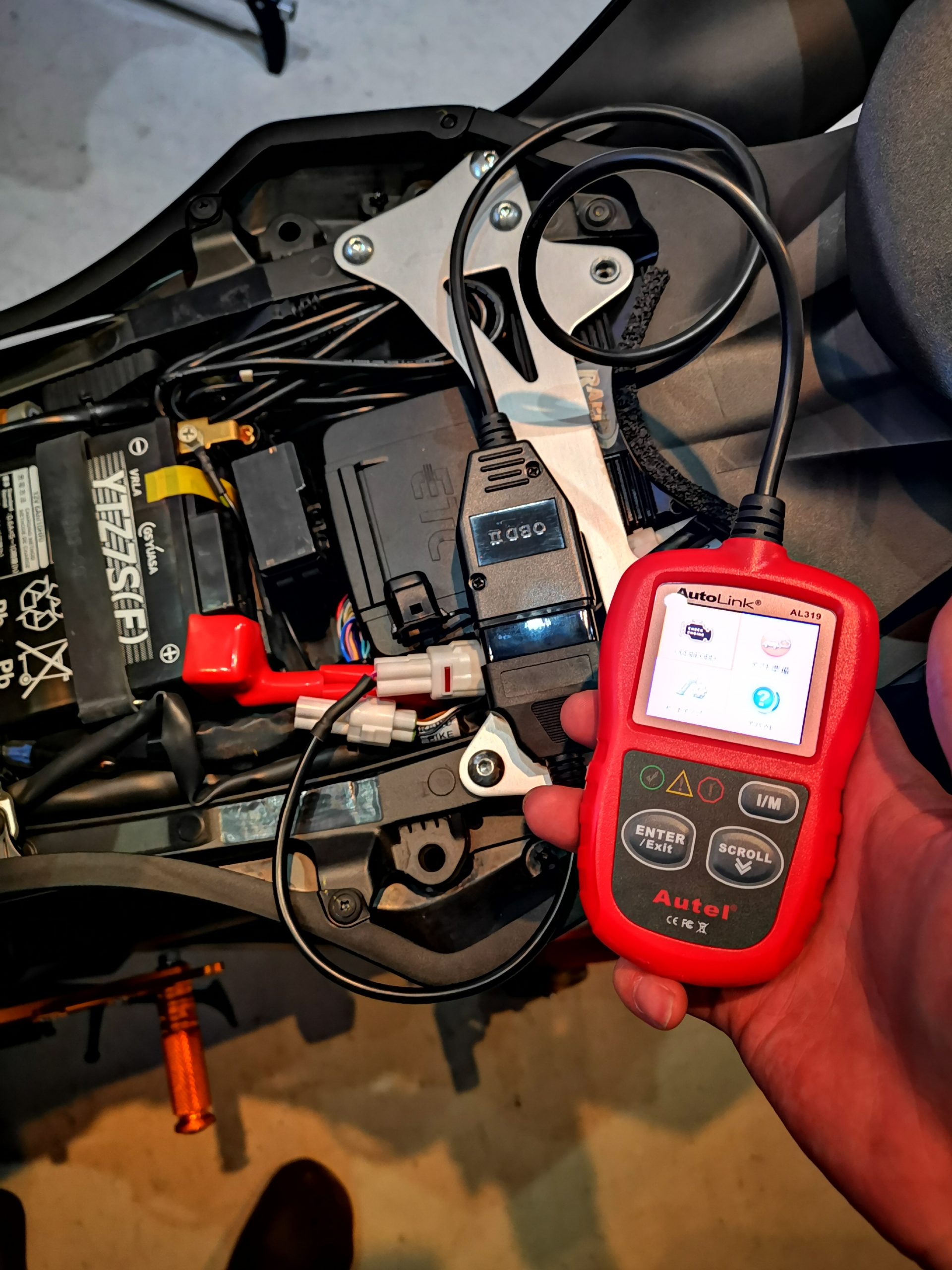 警告灯が点灯した原因がバイクの方に記憶されてしまっているワケなので、OBD2に診断ツールを繋いでエラーコードを消去してやる必要があります。